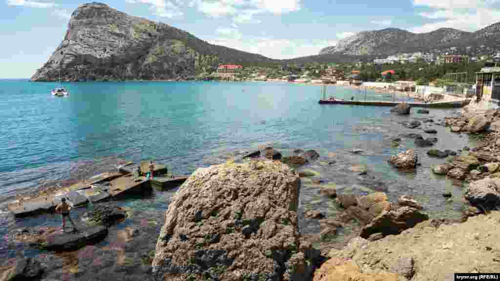 Бухту, где сосредоточено большинство пляжей курортного поселка Новый Свет, еще называют в разных источниках Судак-Лиман, Зеленая, Ниташ, губа Чикенская. Ее восточная часть (на фото) у подножия горы Сокол или Куш-Кая нагромождена скальными глыбами и валунами. Купаться там не совсем комфортно и даже рискованно, учитывая наличие в воде близ берега еще и фрагментов разрушенных, смытых штормами бетонных конструкций. Куш-Кая считается самым большим в Европе, высотою около 500 метров, коралловым рифом.
