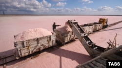 В советские времена тут работал целый промышленный комплекс. Сольпром был подразделением сакского химзавода, добыча шла в десяти бассейнах. В конце восьмидесятых ее сократили, теперь тут работает частное предприятие «Галит». В огороженные участки зимой заливают морскую воду – летом жидкость испаряется, а соль остается. Розовый цвет – это бета-каротин, которым соль насыщается от водорослей под названием Dunaliella Sallina.